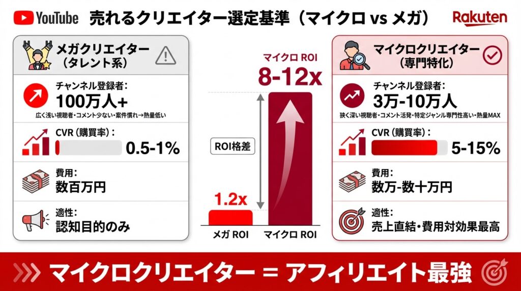まずは、自社の商品と親和性が高く、熱量のある視聴者を抱えるクリエイター(インフルエンサー)を探し出します。 単に「チャンネル登録者数が多い」タレント系のクリエイターを選ぶのは危険です。登録者が数万人規模であっても、特定のジャンル(例えば「30代向けの時短コスメ」「一人暮らしの便利グッズ」など)に特化し、コメント欄で視聴者との深いコミュニケーションが行われている「マイクロクリエイター」の方が、アフィリエイトの購買率(CVR)は圧倒的に高くなります。