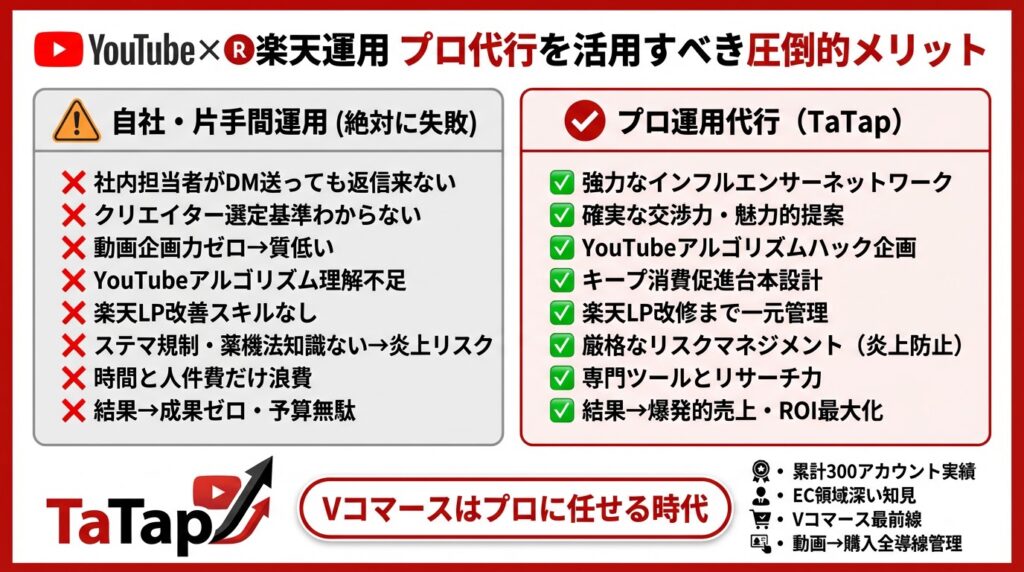 この千載一遇のビッグウェーブに乗り、確実なビジネスインパクト(爆発的な売上と認知拡大)を最速で出すためには、「YouTubeと楽天、双方のアルゴリズムと運用ノウハウを知り尽くしたプロの運用代行会社」を戦略的パートナーとして活用することが、最もROI(投資対効果)が高く、唯一の最適解となります。